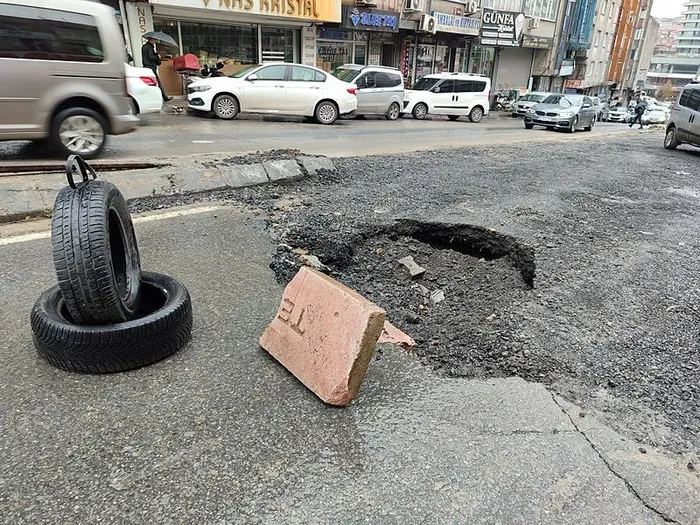 Yetkililer bir süre gelmeyince cadde üzerinde bulunan esnaflar çukurun etrafına araç lastiği ve taşlar koyarak önlem almaya çalıştı.